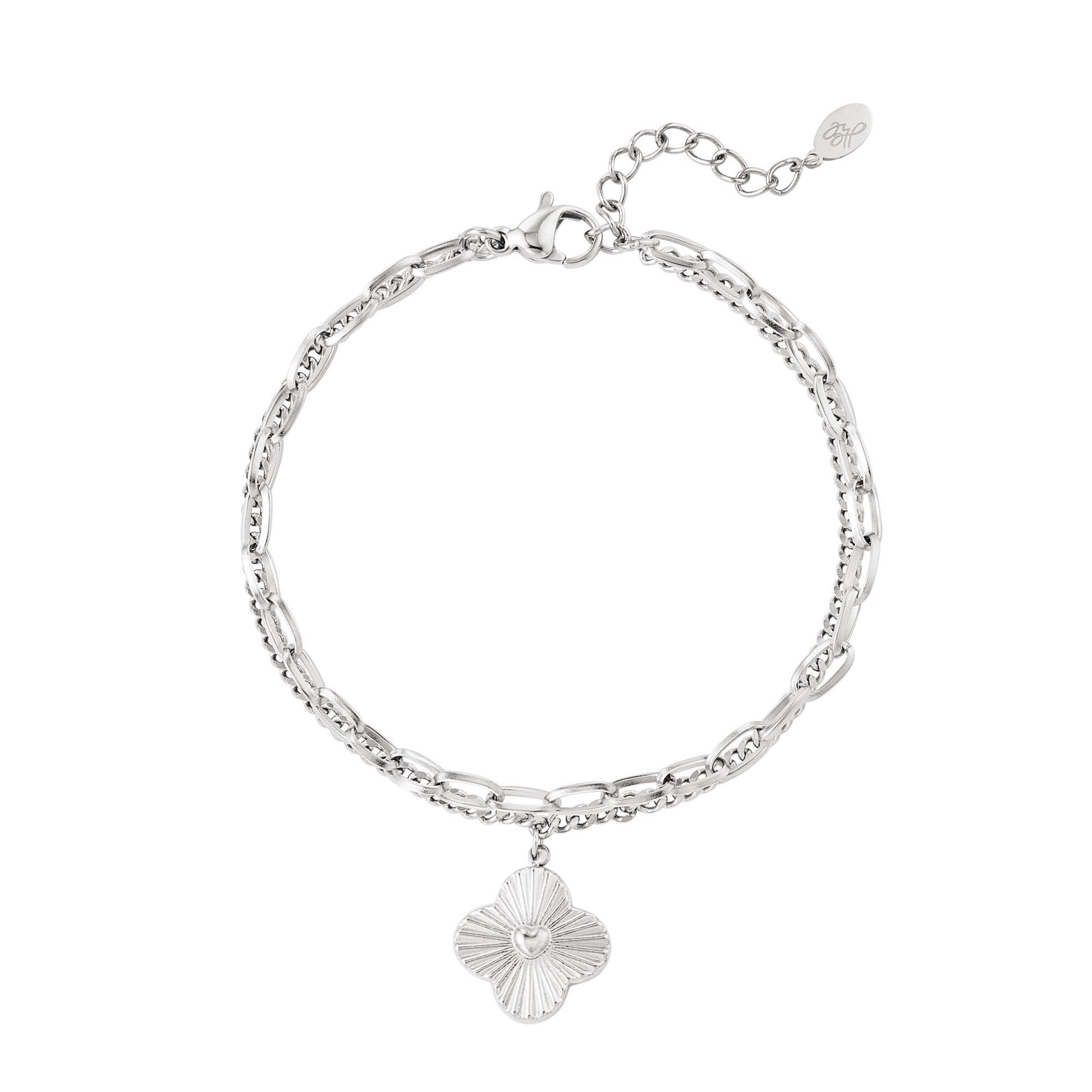 Hoe leuk is deze zilveren tweelaagse armband met bloemenbedel? Deze armband is perfect voor mensen die graag meerdere armbandjes tegelijk dragen, maar niet willen dat de armbandjes in de knoop zitten. Hij is gemaakt van stainless steel, verstelbaar van 16 cm tot en met 19 cm en verkrijgbaar in zowel goud als zilver.