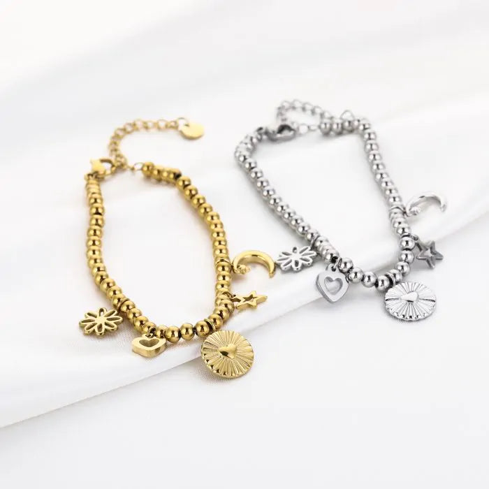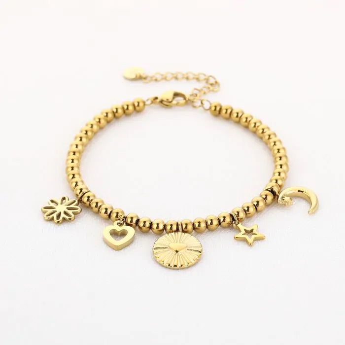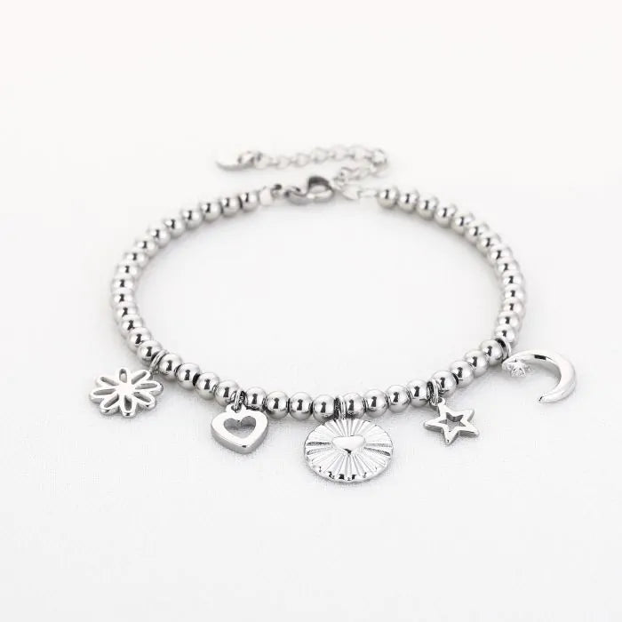 Charm me softly is de ultieme armband voor als je niet kunt kiezen tussen lief, speels en een beetje mystiek. Deze stainless steel kralenarmband is versierd met de schattigste bedeltjes: een hartje (voor de liefde), een bloemetje (voor groei), een sterretje (voor jouw sparkle) en een maantje (voor een tikkeltje magie).