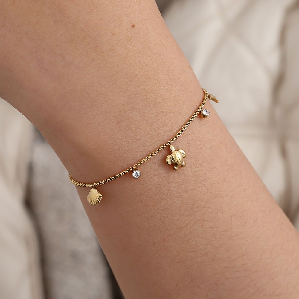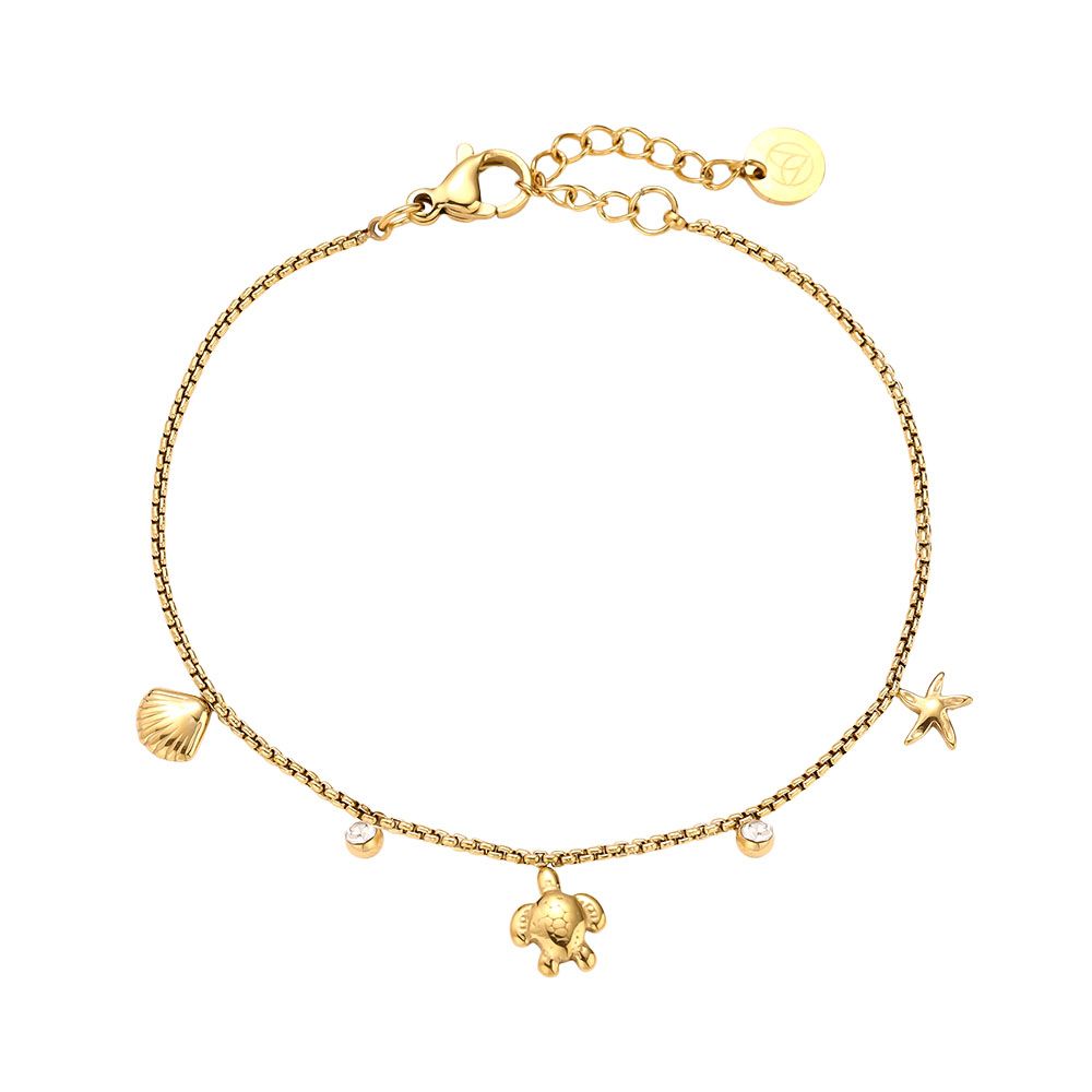 Hoe schattig is dit armbandje in beach thema? Het armbandje heeft kleine zeedieren en zirkonia steentjes. Perfect voor een heerlijke zomerdag. Het armbandje is gemaakt van stainless steel en zowel in goud als zilver verkrijgbaar.