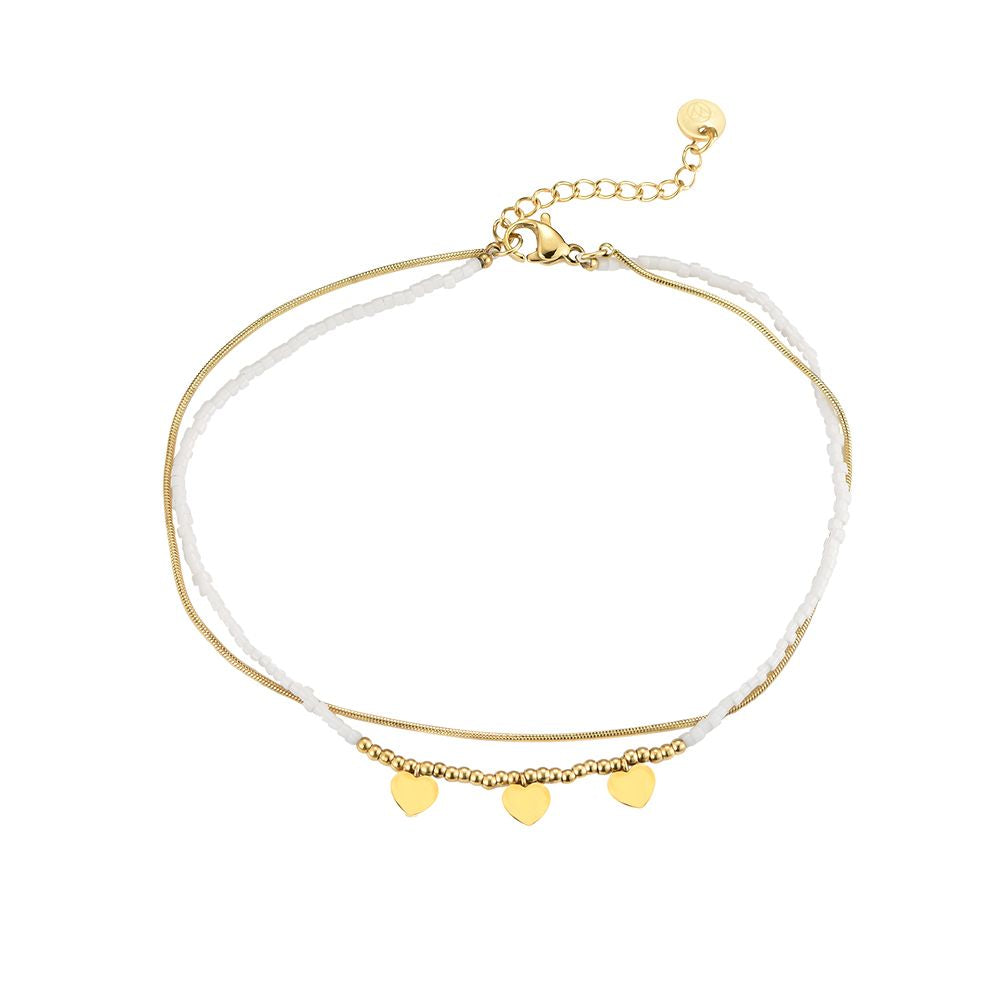 Te leuk dubbel enkelbandje met witte kraaltjes, gouden ketting en gouden hartjes.