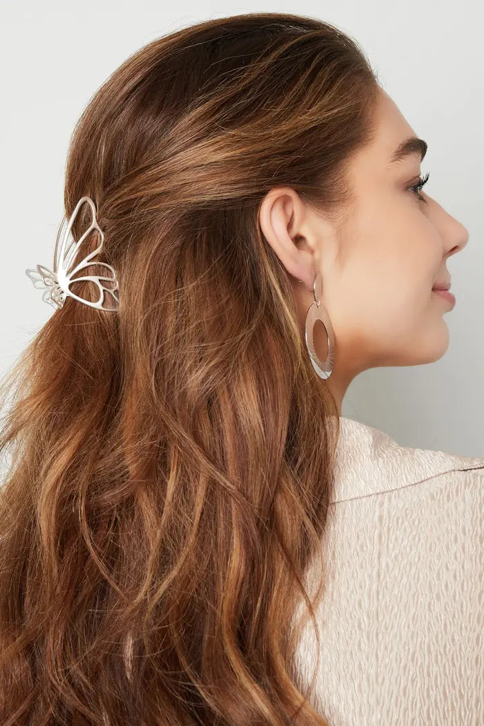 Hoe leuk is deze haarklem in de vorm van een vlinder! Onze echte bestseller wat haarklemmen betreft! De haarklem is gemaakt van metaal en heeft een afmeting van 7,5 cm. Perfect om een gedeelte of al jouw haren op een leuke manier op te steken! Je kunt deze haarklem perfect gebruiken voor een casual look, maar ook voor een chiquere look is haarklem vlinder zeker een aanrader. Je shopt haarklem vlinder in de kleuren zilver en goud!
