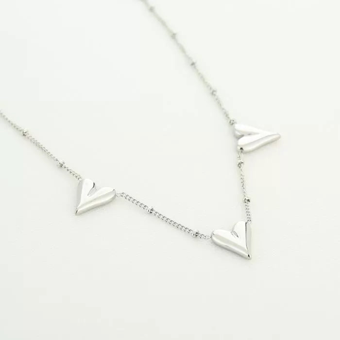 Hoé gaaf is deze ketting met 3 hartjes? De ketting heeft 3 hartjes en is gemaakt van stainless steel. De ketting heeft een lengte van 40 tot 45 cm en is verkrijgbaar in zilver.