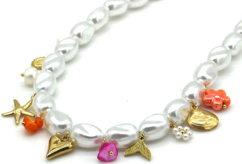 Voeg een speelse, elegante touch toe aan je look met deze parelketting, verfraaid met roestvrijstalen bedels. De parels hebben een zachte glans en zijn licht van gewicht, waardoor je ze moeiteloos de hele dag kunt dragen. De stainless steel bedels geven de ketting een moderne, duurzame uitstraling – perfect voor elke gelegenheid, van casual tot chic. Deze ketting is niet alleen stijlvol, maar ook nikkelvrij en hypoallergeen, dus ideaal voor de gevoelige huid.