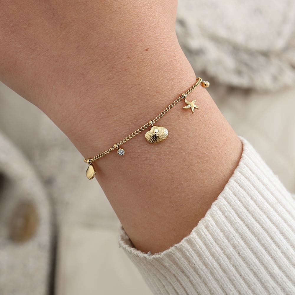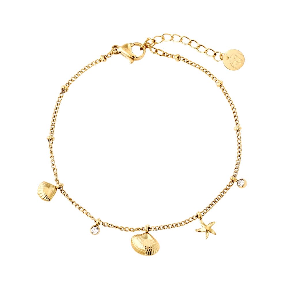Hoe schattig is dit armbandje met kleine bedels in beach thema? Het armbandje heeft kleine schelpjes, steentjes en een zeesterretje. Perfect te combineren met andere armbanden in beach thema voor een te leuke armbandenstack! Wist je trouwens dat beach dé trend is van komend seizoen? De armband is gemaakt van stainless steel en verkrijgbaar in zowel goud als zilver.