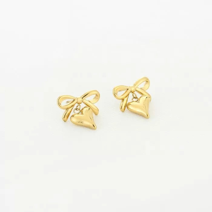 Hoe schattig zijn deze oorbellen met een strikje en hartje? De oorbellen zijn van stainless steel en hebben een lengte van 1,5 x 0,8 cm. Ze zijn verkrijgbaar in zowel goud als zilver.