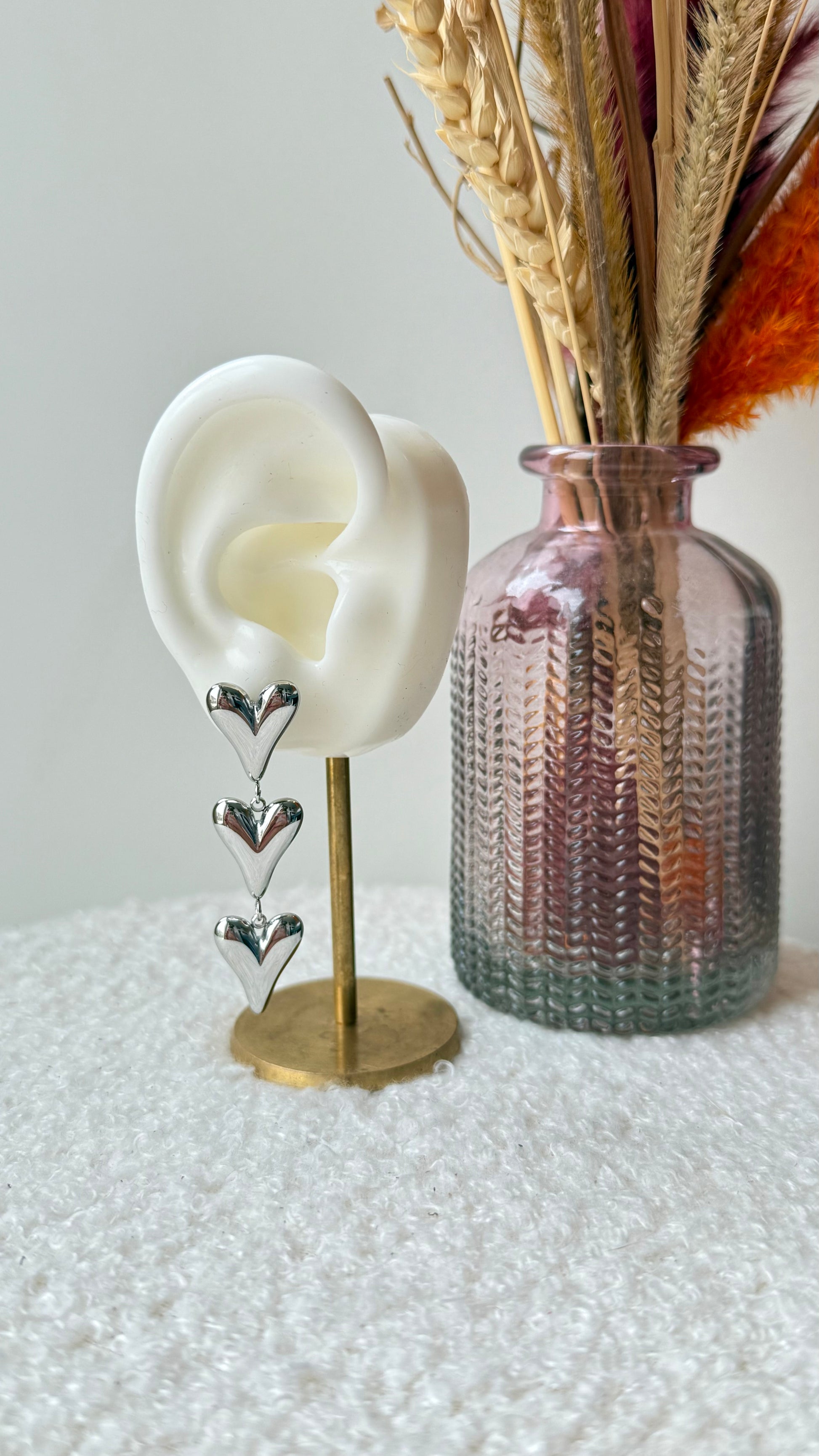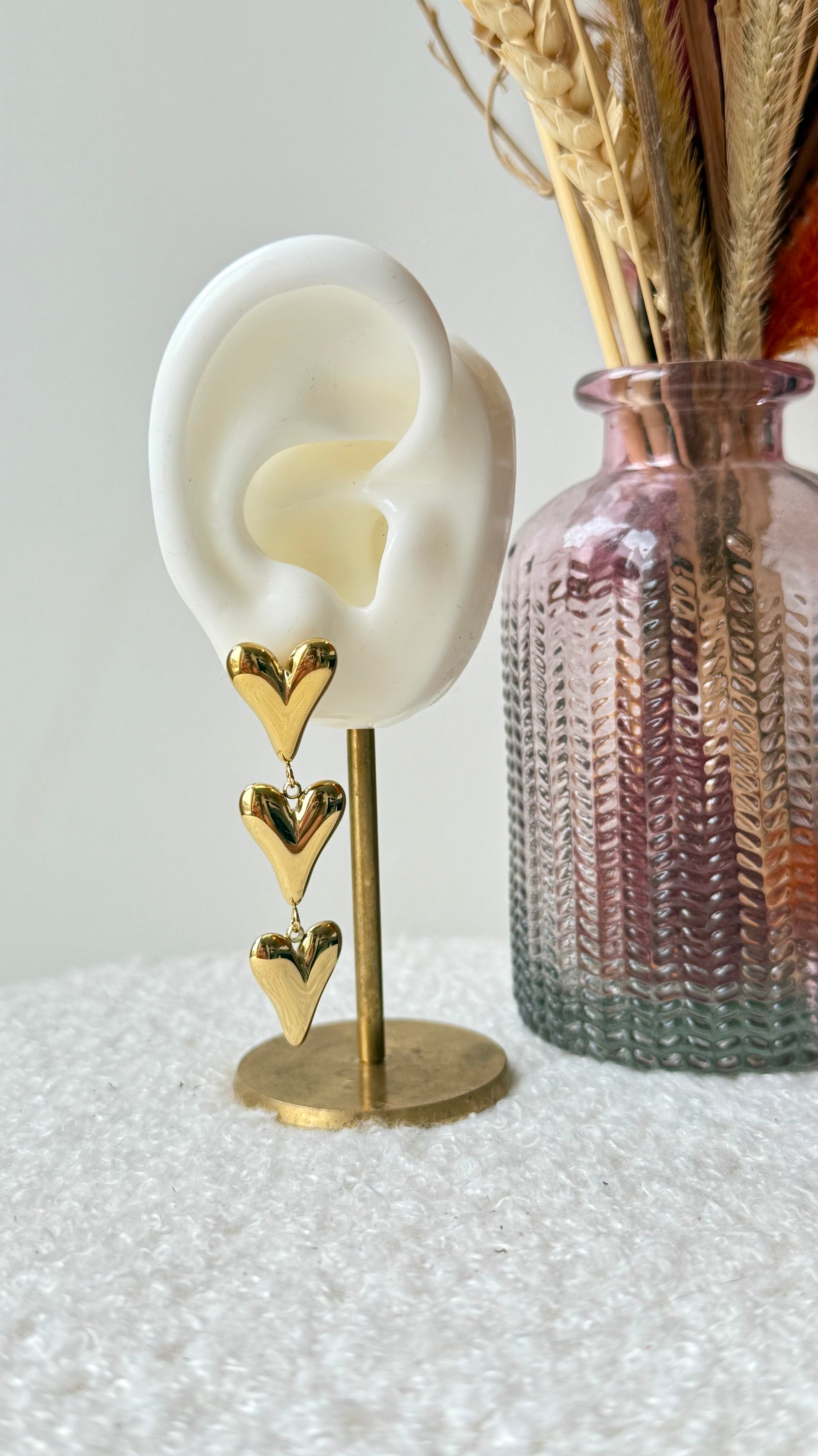 Met deze oorbellen steel je gegarandeerd de show! De drie harten onder elkaar zorgen voor een speelse én romantische look, terwijl het langere design een elegante touch geeft. Perfect om te dragen tijdens een feestje, etentje of gewoon om je dagelijkse outfit dat beetje extra liefde te geven.