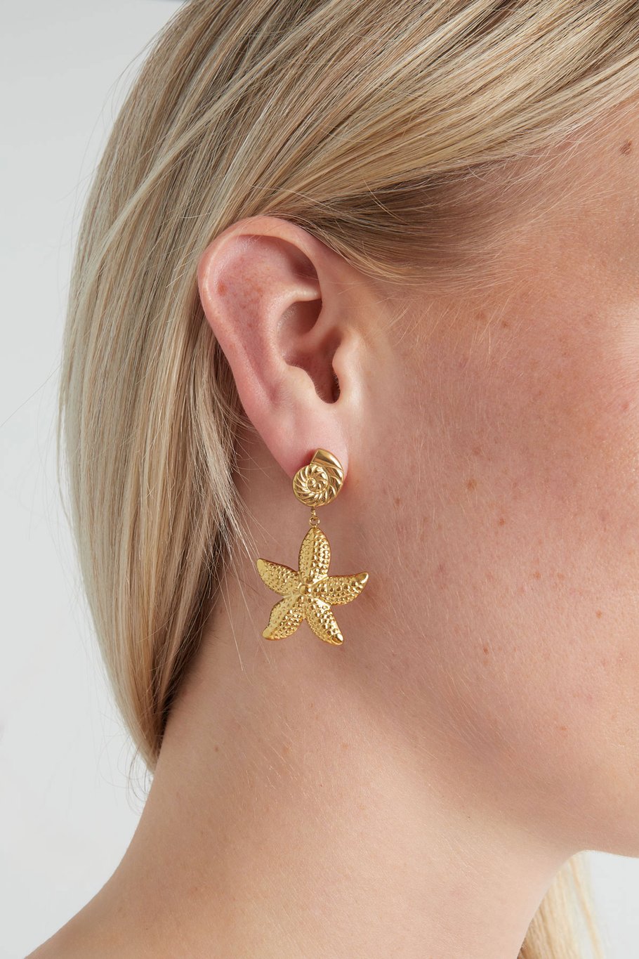 Helemaal passend bij de zee sieradentrend; deze gave oorbellen met zeester en hoornschelp. Heel chique om je outfit helemaal af te maken!
