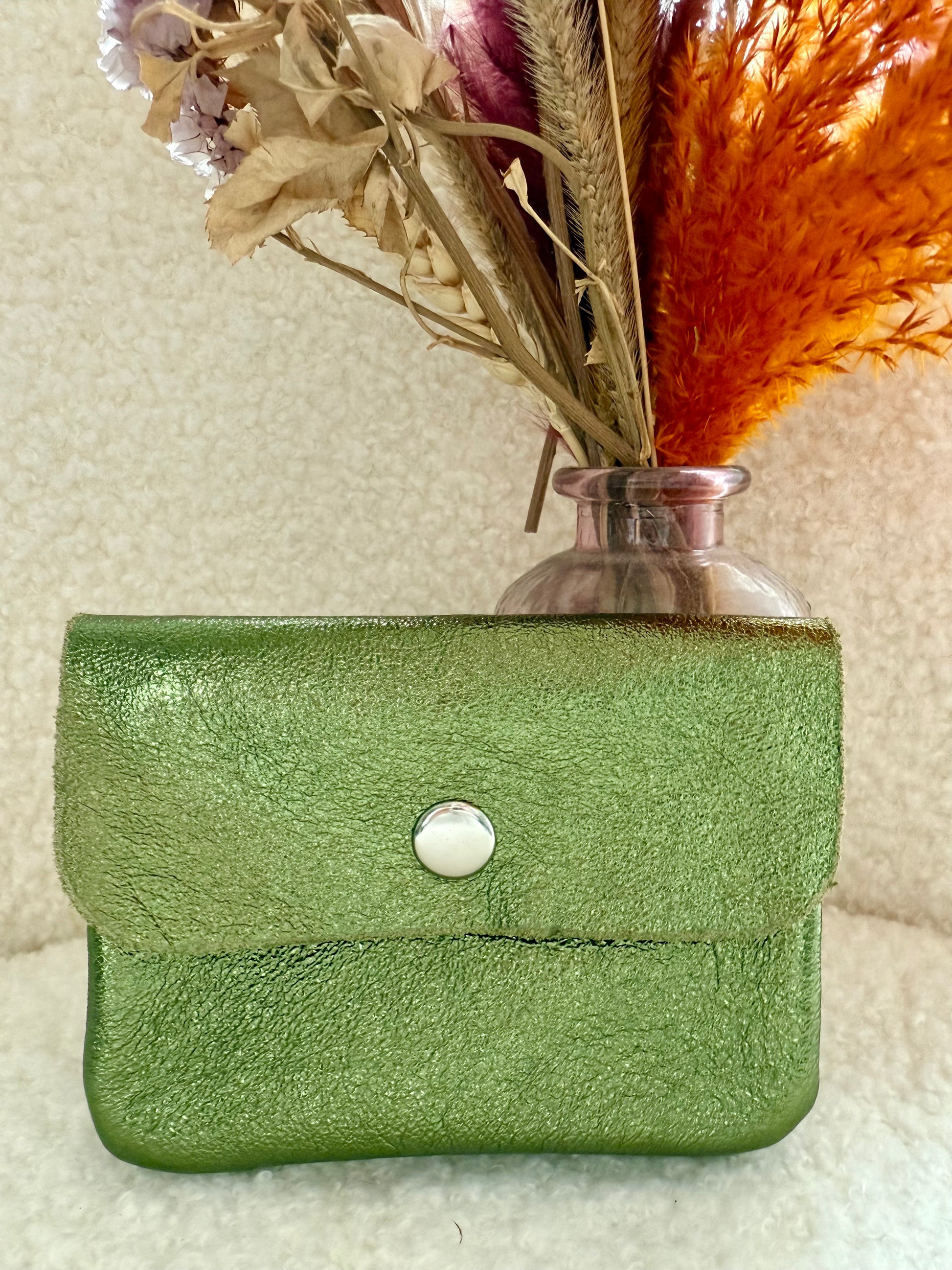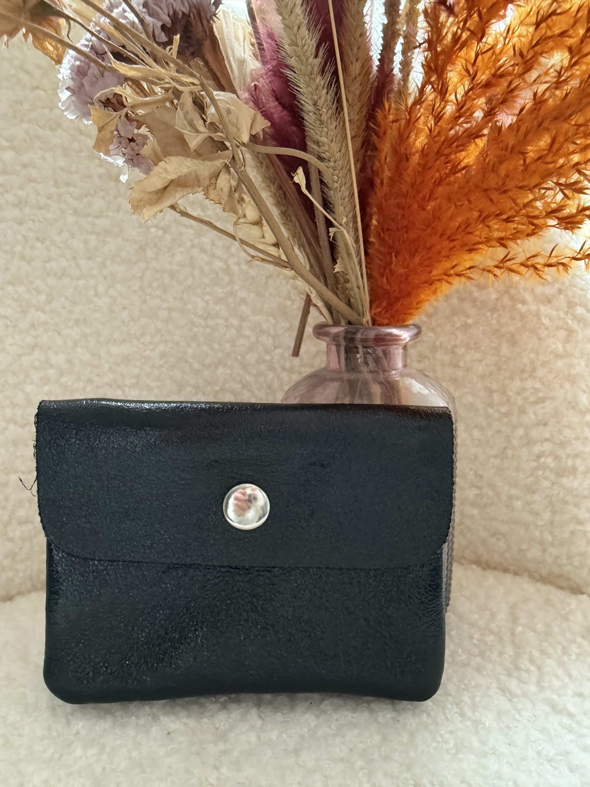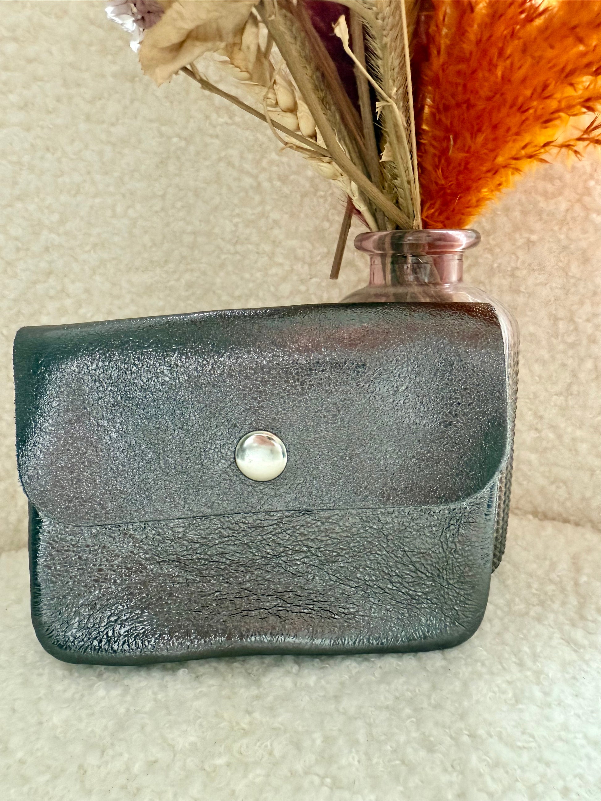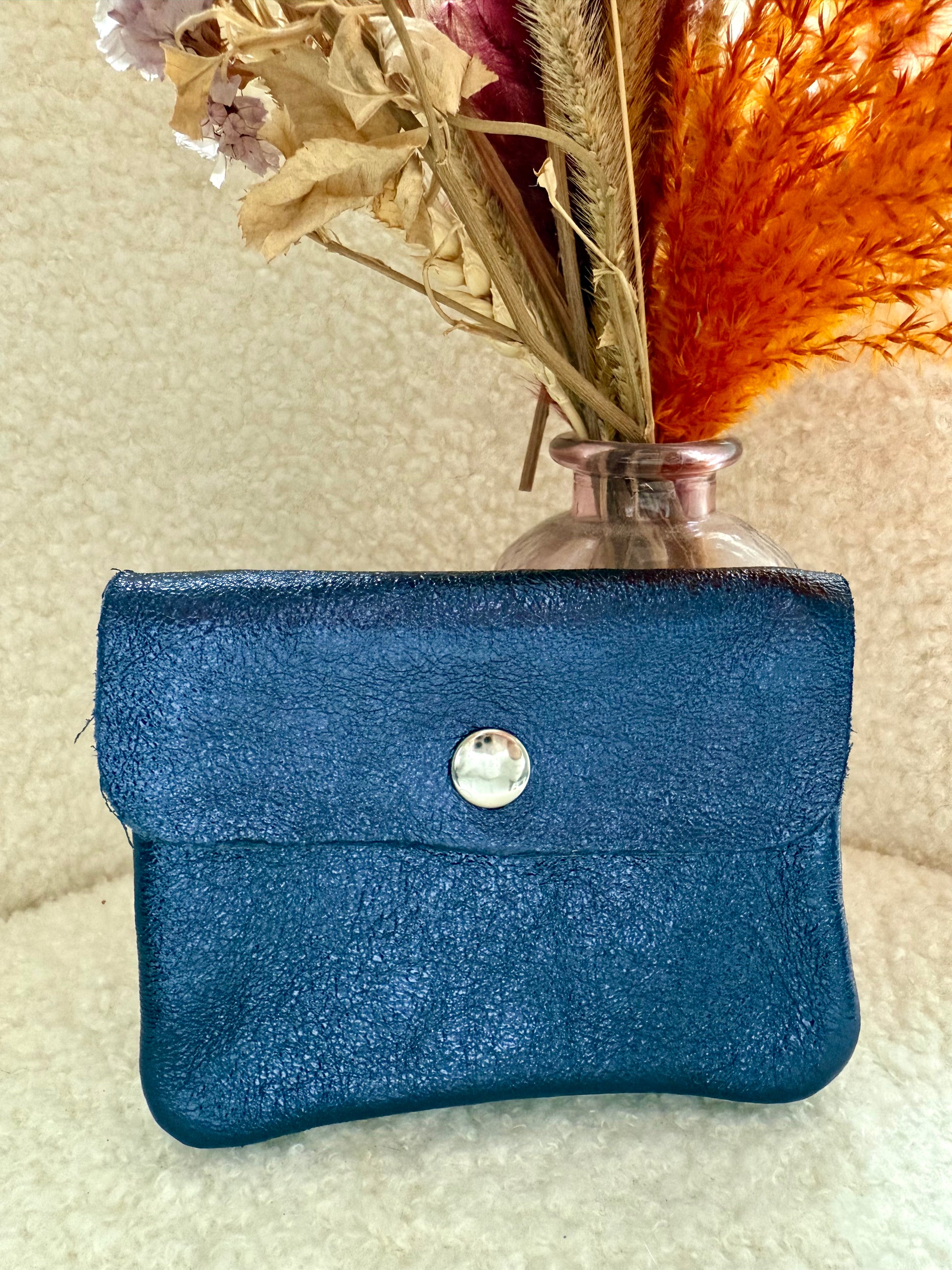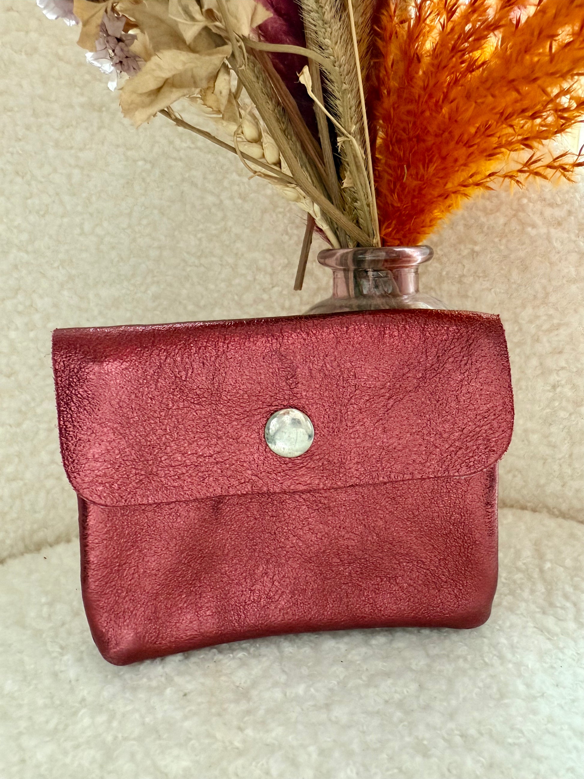 Handgemaakt portemonneetje van Italiaans leer. Het portemonneetje heeft een drukknoopje en twee vakjes aan de binnenkant. 1 vak voor pasjes/ briefgeld. 1 vak met rits voor muntgeld. Er passen heel wat pasjes in het portemonneetje gezien het leer soepel is.
