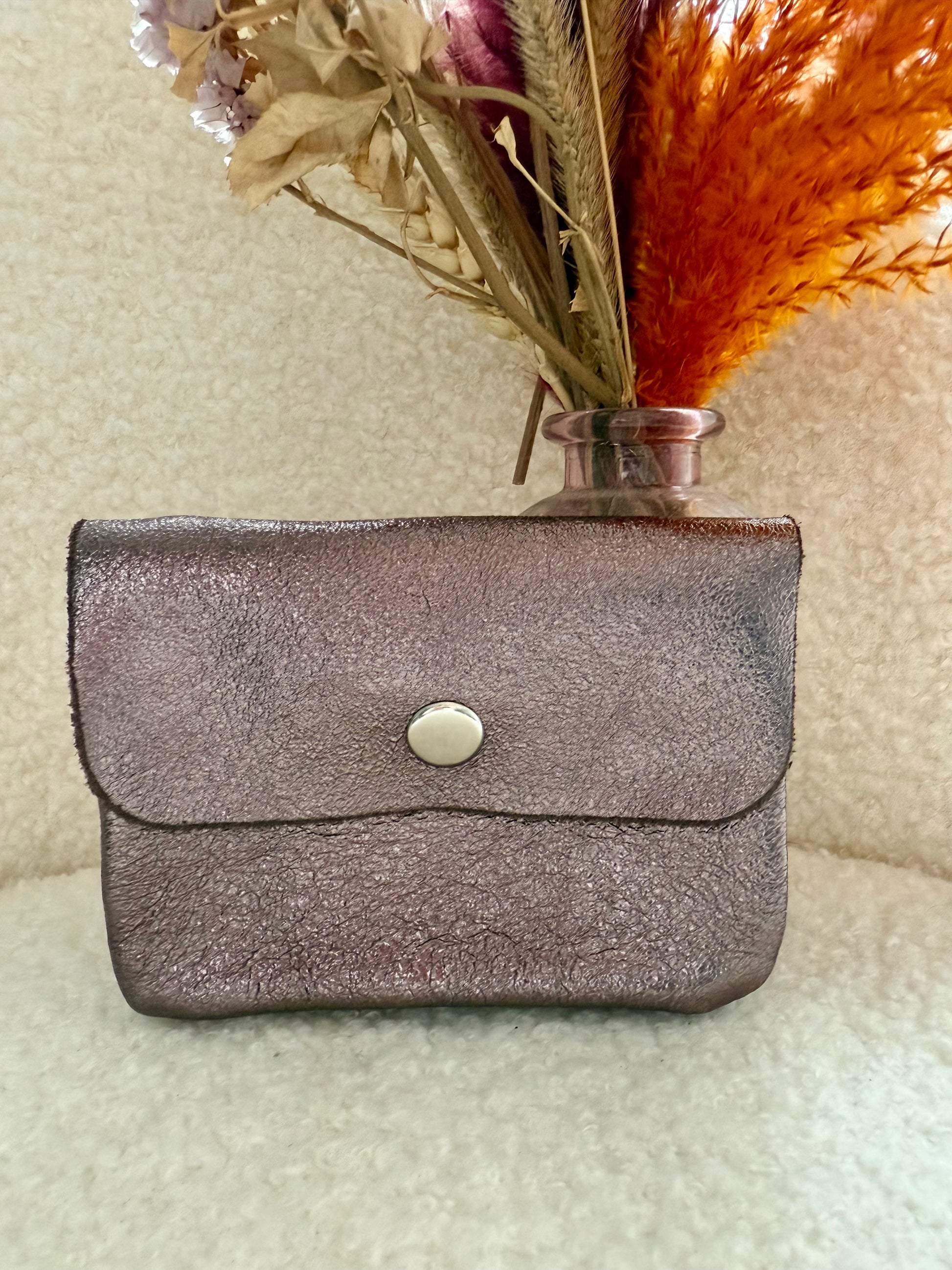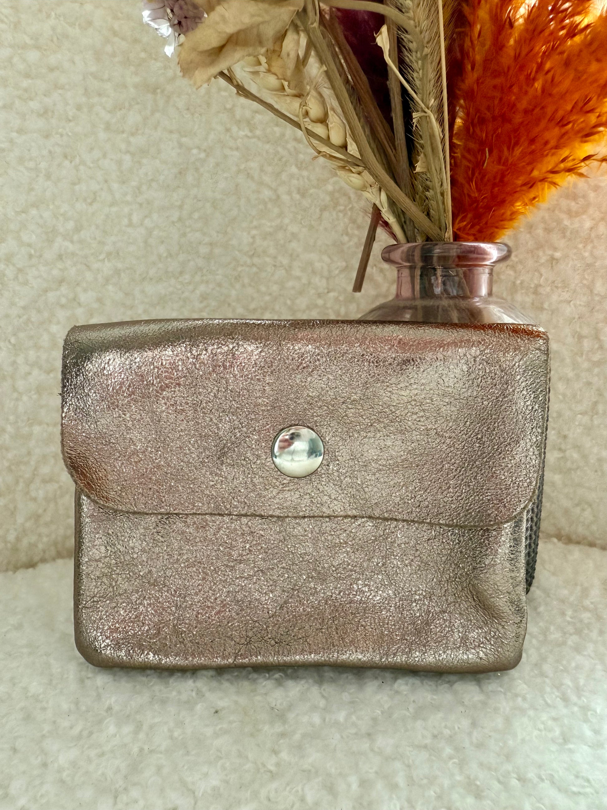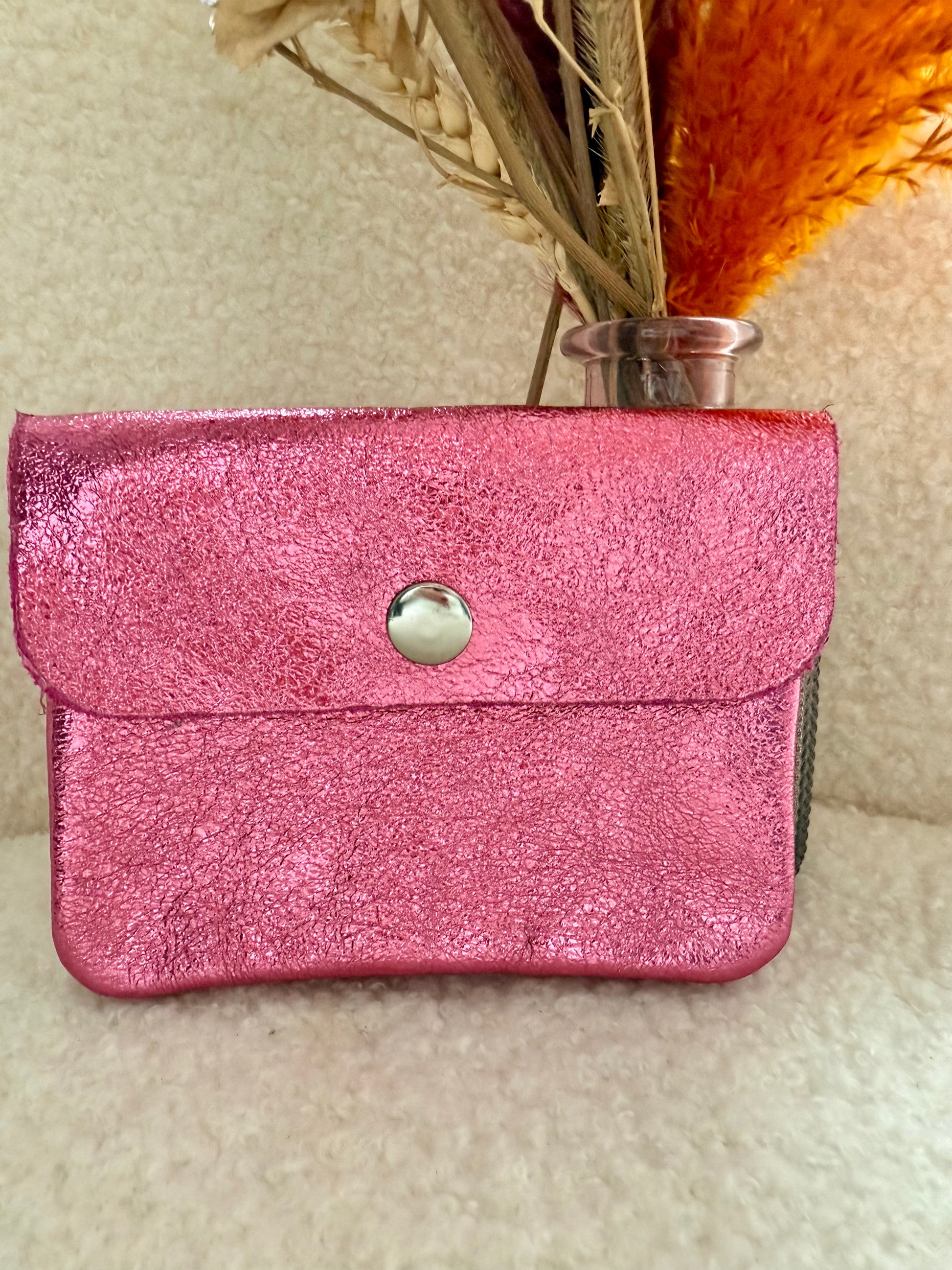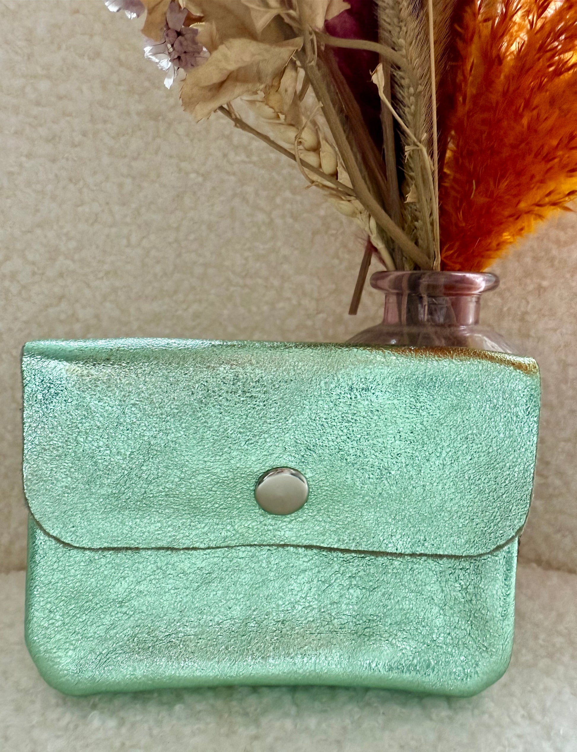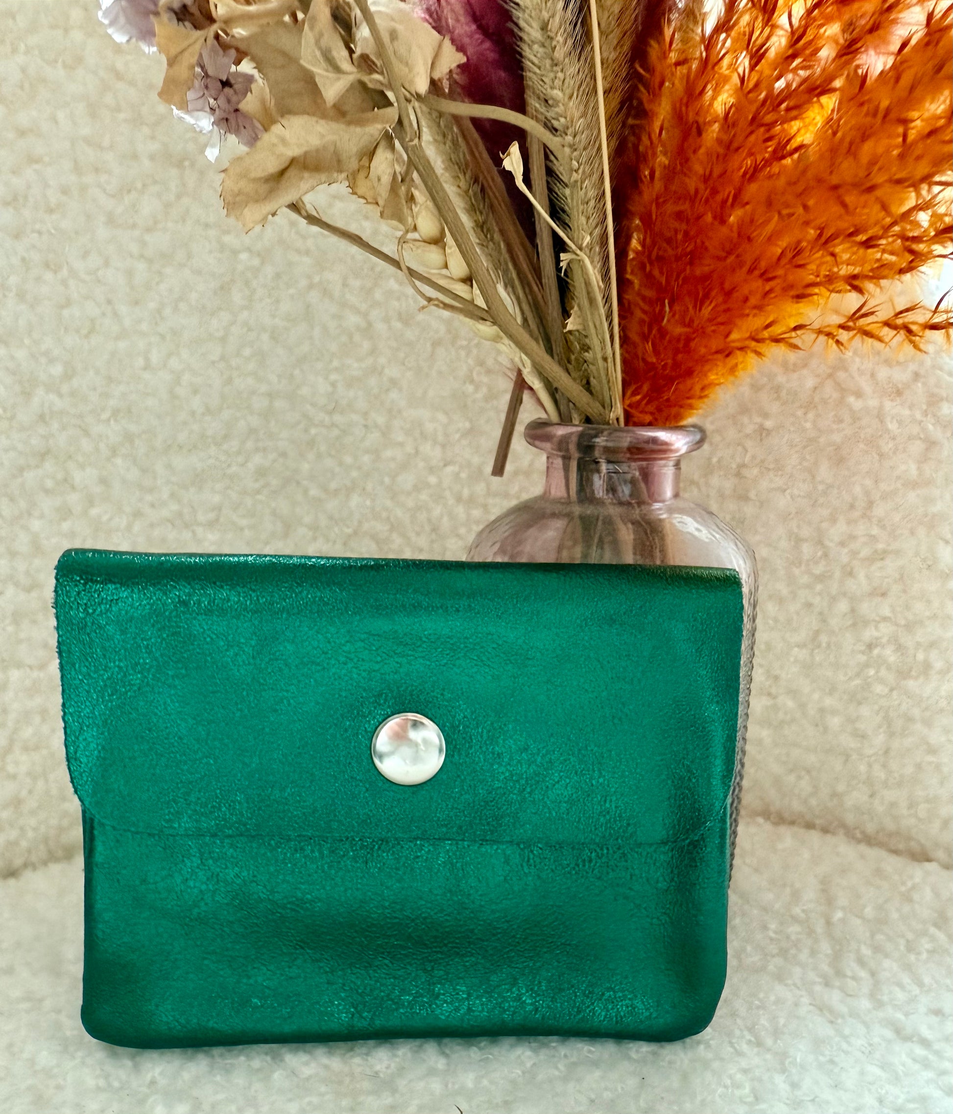 Handgemaakt portemonneetje van Italiaans leer. Het portemonneetje heeft een drukknoopje en twee vakjes aan de binnenkant. 1 vak voor pasjes/ briefgeld. 1 vak met rits voor muntgeld. Er passen heel wat pasjes in het portemonneetje gezien het leer soepel is.