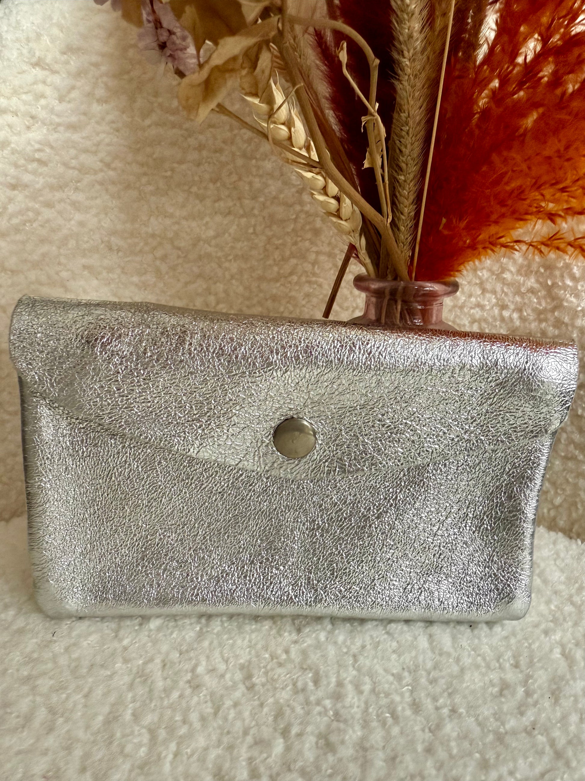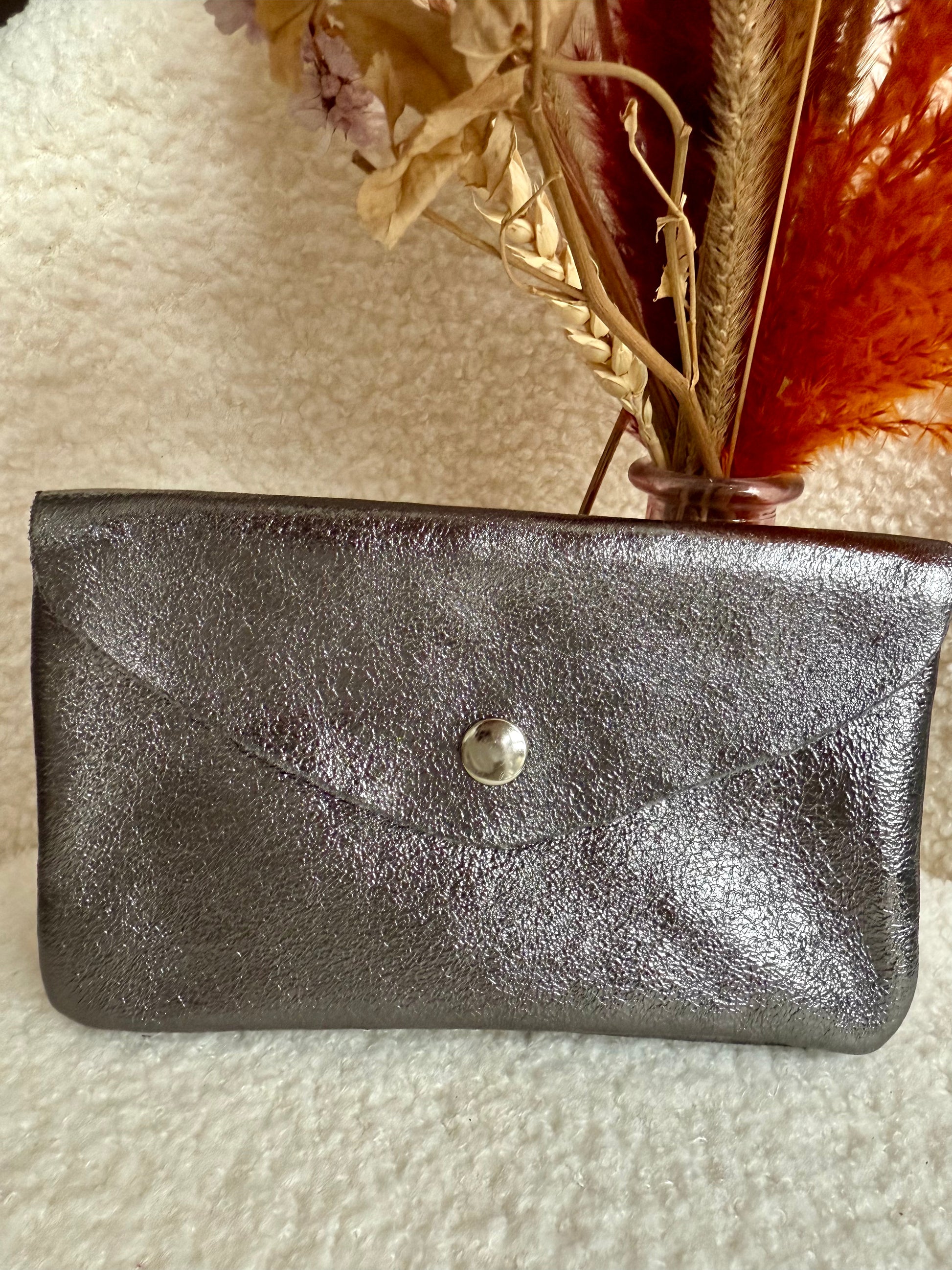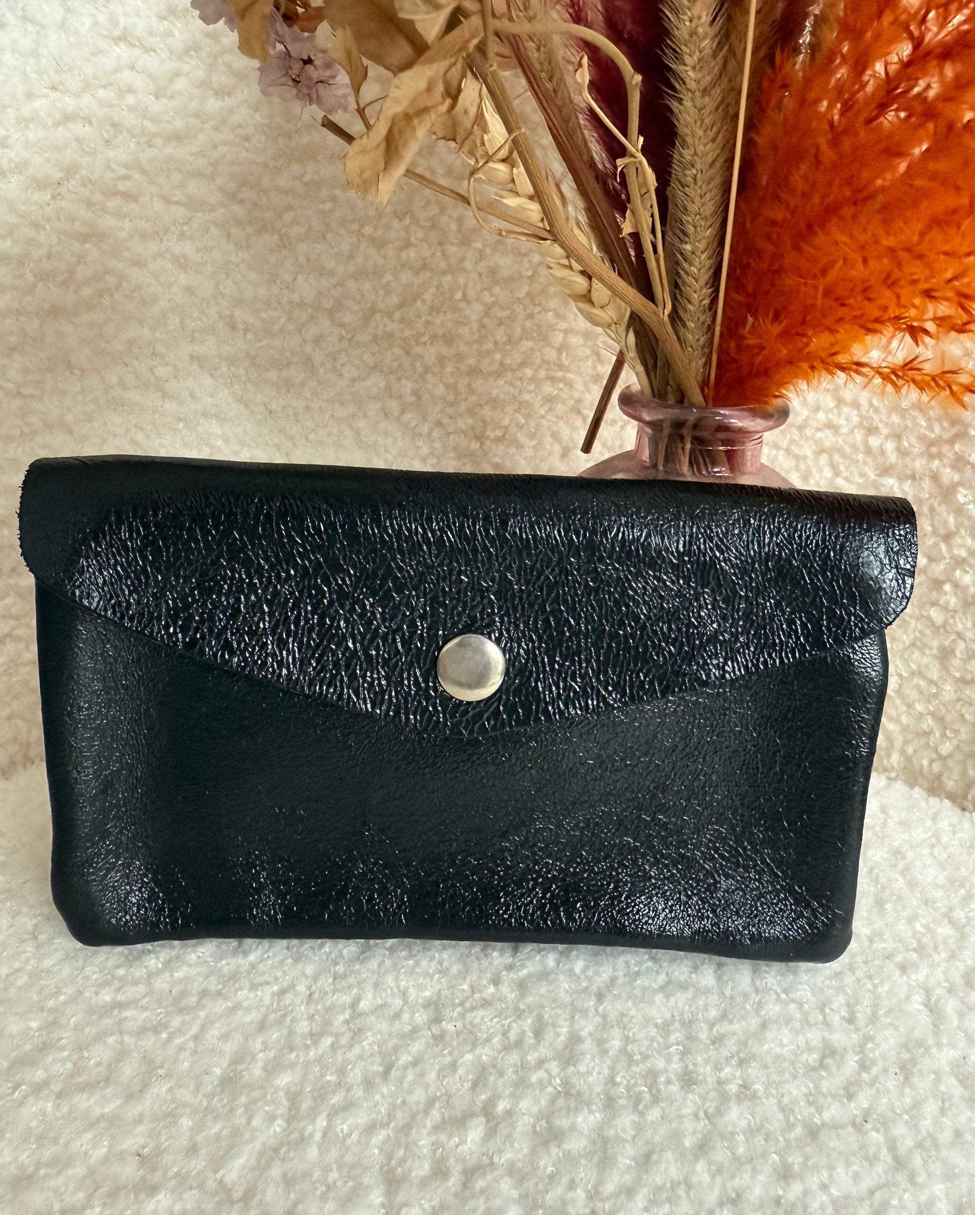 Handgemaakt portemonneetje van Italiaans leer. Het portemonneetje heeft een drukknoopje en twee vakjes aan de binnenkant. 1 vak voor pasjes/ briefgeld. 1 vak met rits voor muntgeld. Het briefgeld past in dit portemonneetje er rechtop in.