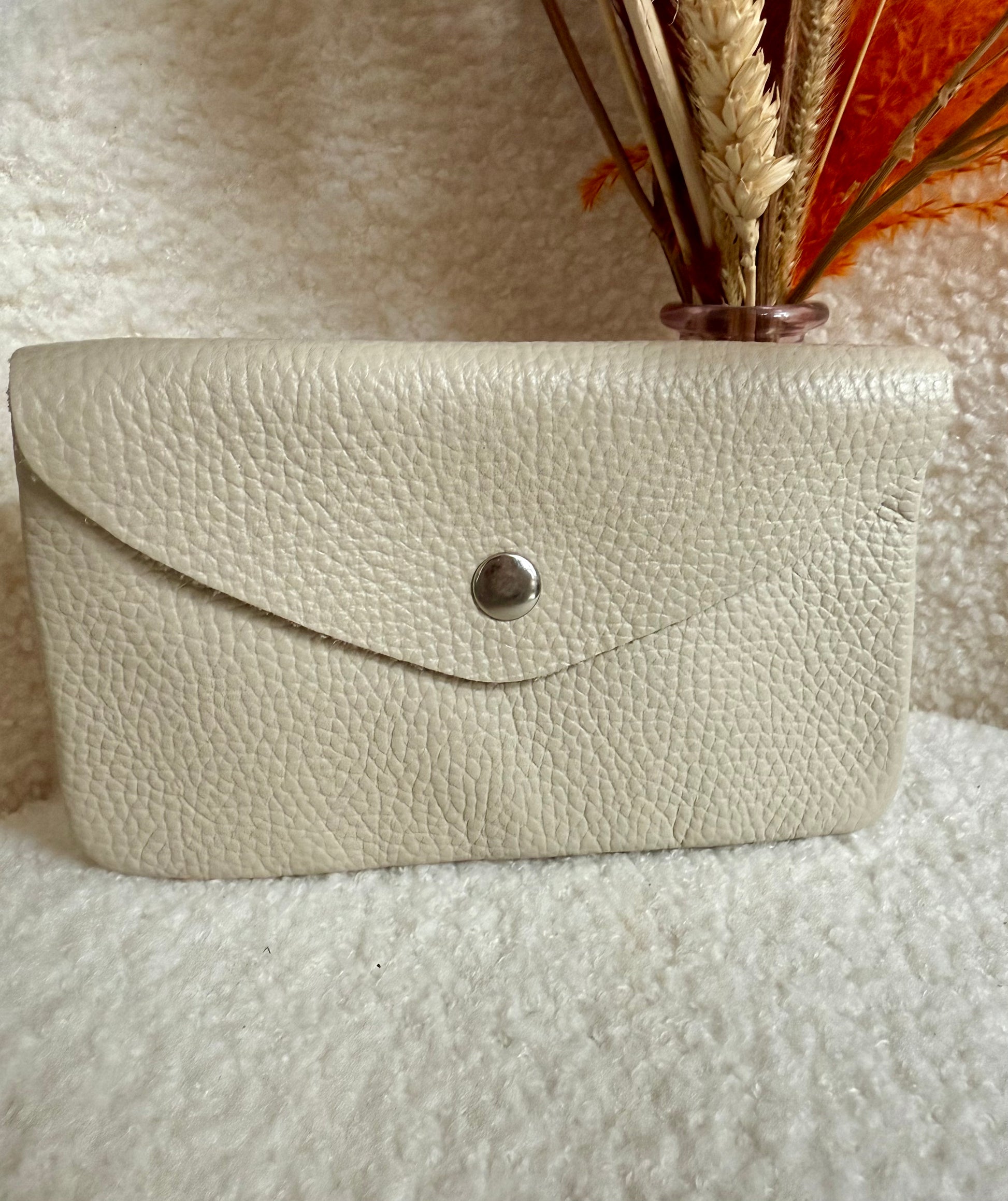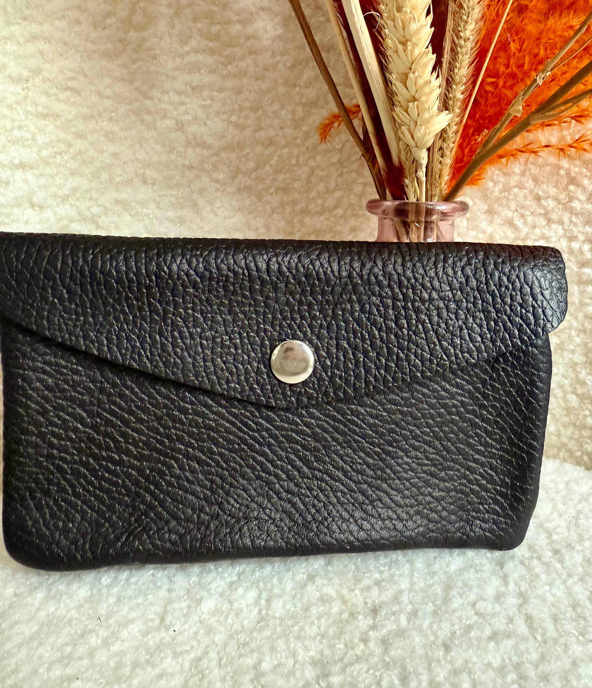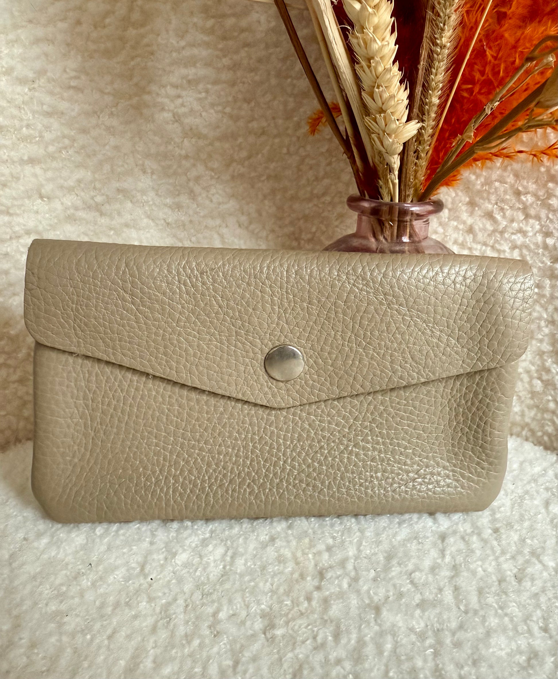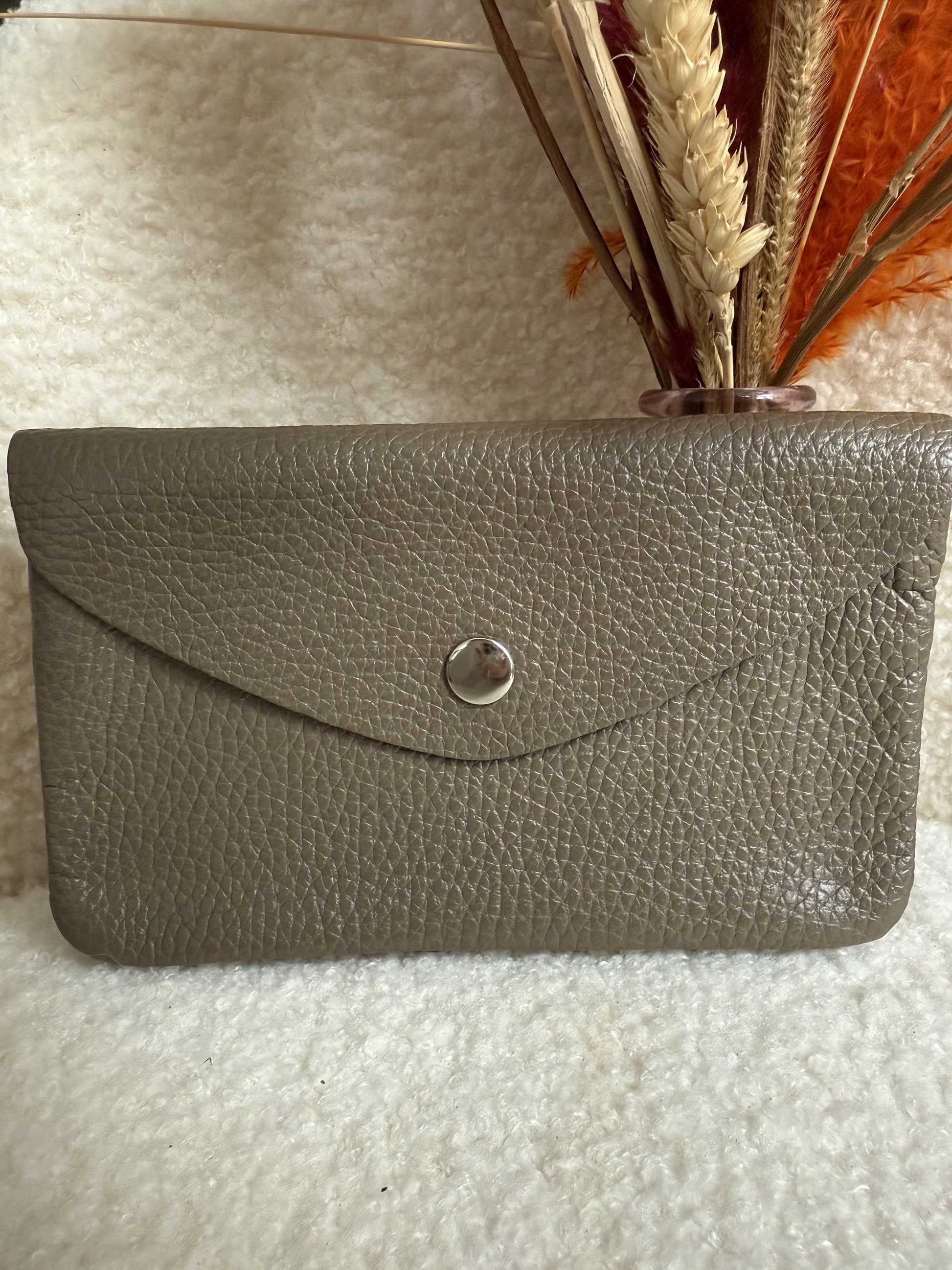 Handgemaakt portemonneetje van Italiaans leer. Het portemonneetje heeft een drukknoopje en twee vakjes aan de binnenkant. 1 vak voor pasjes/ briefgeld. 1 vak met rits voor muntgeld. Er passen heel wat pasjes in het portemonneetje gezien het leer soepel is. In deze grote variant passen briefjes rechtop in het vakje.
