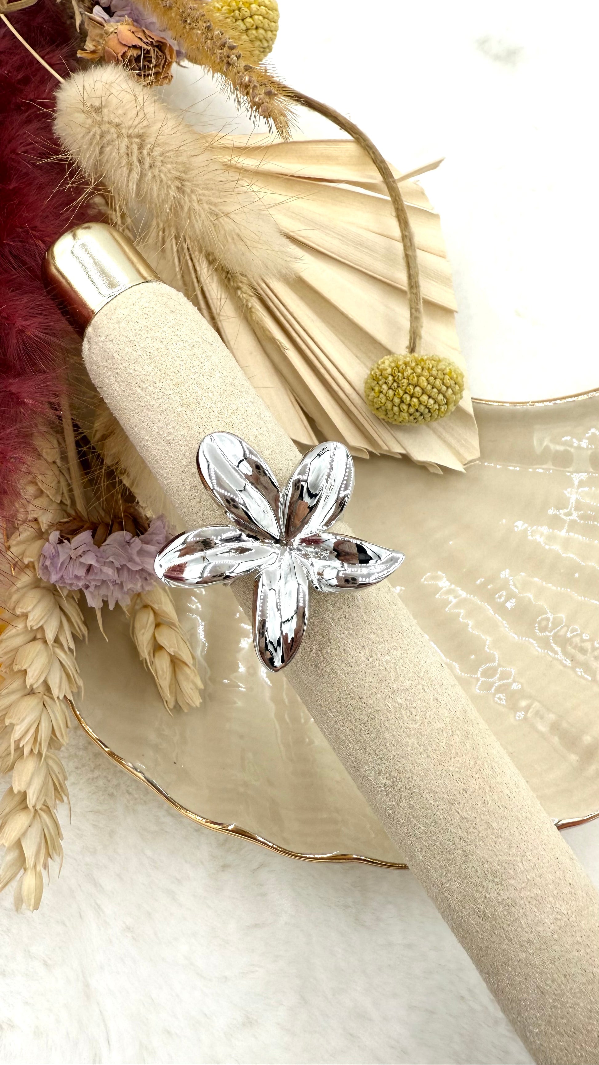 De Bali bloem was bij ons al ontzettend populair als haarclip, maar we hebben hem nu ook als ring! Hoé leuk om te combineren met de Bali bloem haarclip of andere toffe ringen? De ring is verkrijgbaar in zowel goud als zilver en verstelbaar!