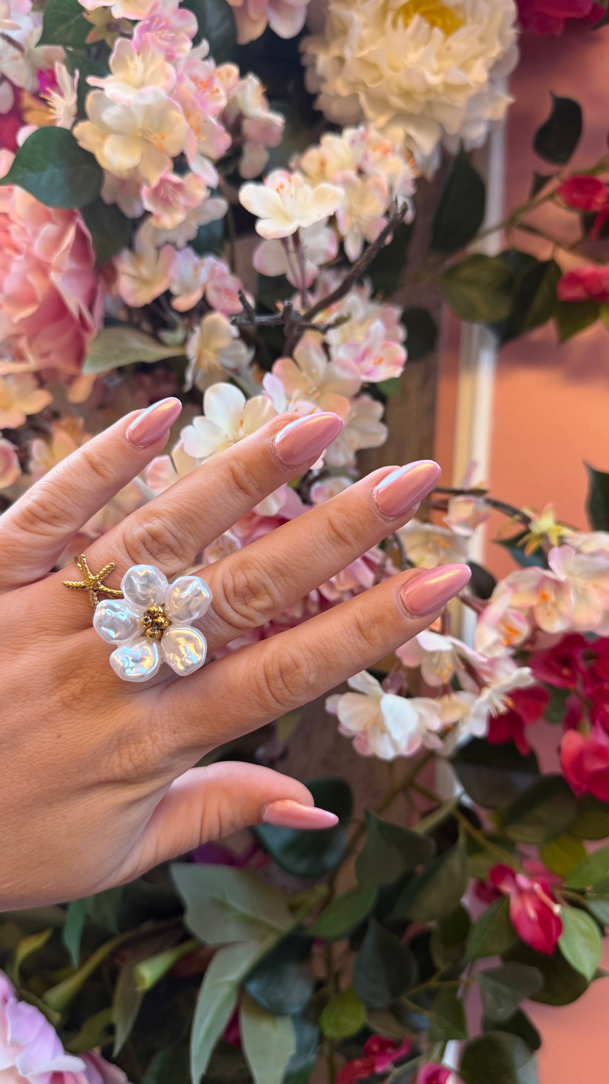 Petal Flower – deze ring is bold, bloemig en helemaal fabulous! De grote bloem met parelmoer glans vangt meteen alle aandacht en geeft je look een zachte, vrouwelijke touch met nét dat beetje extra shine. Verkrijgbaar in zowel goudkleur als zilverkleur, dus voor elke stijl een match.